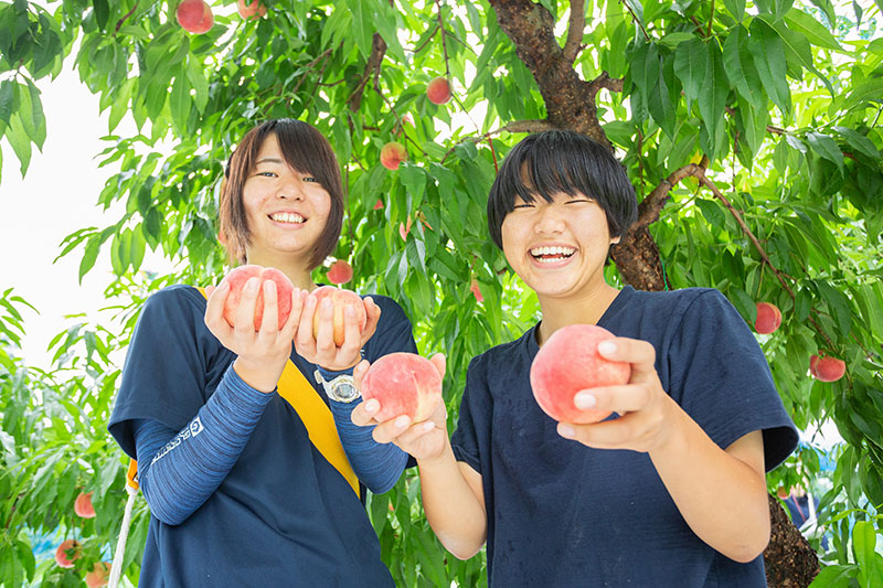 真夏のモモの他にも、初秋からのナシ、秋本番のブドウとカキ、冬場のリンゴへと、ほぼ年間でさまざまな果樹栽培を実習できるのも、アグリカレッジ福島ならでは。また、モモを始めとした果実や米、花卉、野菜などが市場より安く購入できる直売会の開催時は、町内外から果物を多くの方が果実を求めて来場するほど人気商品になっています。もちろん果樹専門の学科らしく、大規模栽培や複合栽培などの安定生産に向けた実習や省力化、ハウス栽培などの先進的な技術も学ひます。