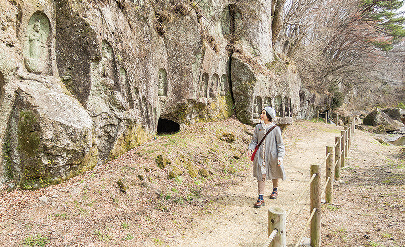 観音菩薩を始めとする37体の仏像群が彫刻されている隈戸川沿いの崖。江戸時代に書かれた『白河風土記』にはこの崖仏群の記載があり、町名の由来とされている建立の経緯が記されている。崖上に鎮座する滝八幡社の祠は、地名ゆかりの神社とされている。