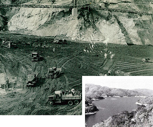 ダムの工事風景台形状に盛り土をして堰堤を形成するアースダムで、灌漑用ダムでは日本屈指の規模を誇る。