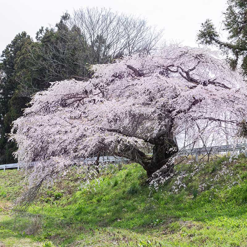 矢吹名物の桜のひとつで、町内の中でも長寿、最も色がきれいとされている桜です。種類はエドヒガン、目通り幹4.7m、樹高12m、推定樹齢300年の老巨木。樹勢も旺盛で、花は淡紅色、満開時の美しさは見事です。