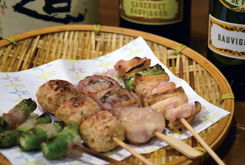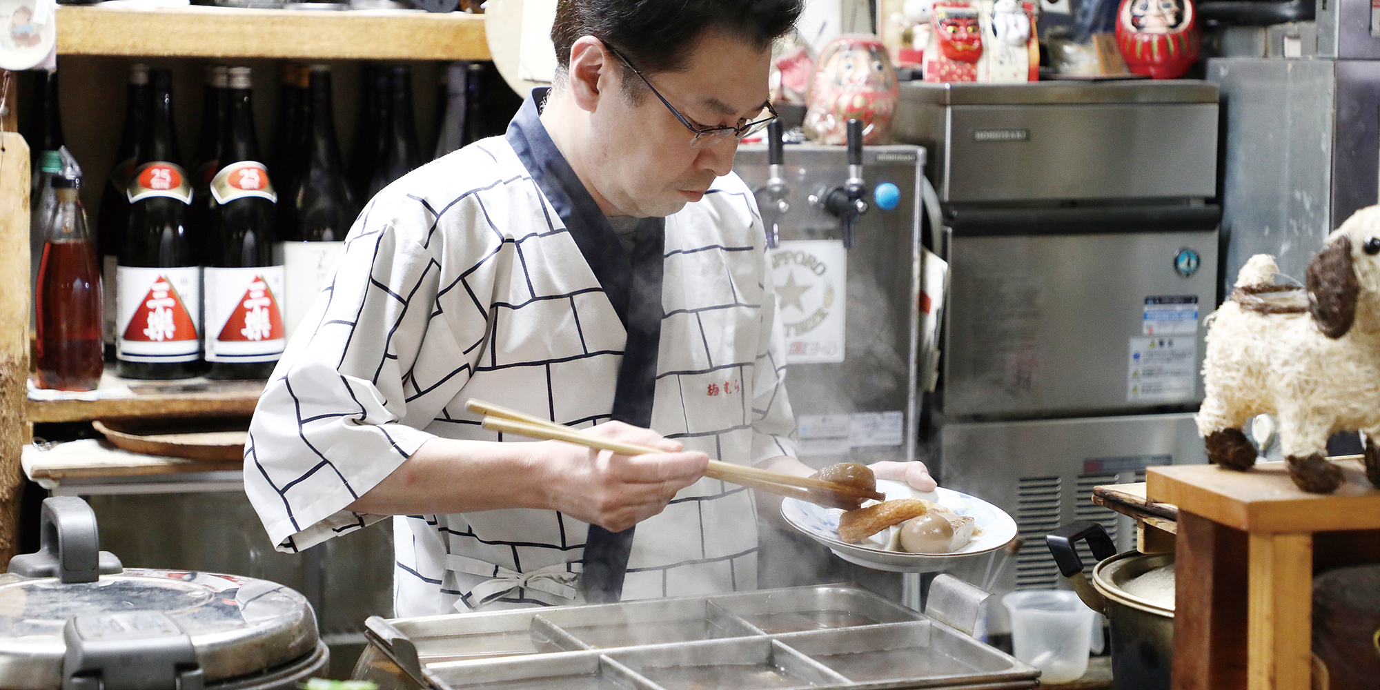 店に入ると、昭和の時代に戻ったかのような懐かしい雰囲気が漂っていた。名物はもつ煮込みとおでん、そして炭火でじっくり火を入れた焼き鳥だ。創業以来注ぎ足し続けるつけだれや、黒ごまや生姜を加えた自家製のにんにく味噌をつけて楽しめる。熱燗もいいが、レモンサワーもいいな……。ほろ酔い気分になったら、しその実や山ごぼうといった具材で女将さんが握ってくれるおにぎりで締めたい。