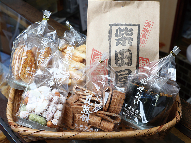 「せんべいは生き物なんです」そう話すのは3代目主人の柴田秀一さん。その日の温度や湿度によって水分量を変えたり、焼き加減を調節したり。長年続けても勉強の連続だとか。約 種類あるが、そのどれもが微妙なさじ加減が必要な職人技でできている。名物は小麦生地の瓦煎餅。餅生地をこうばしく焼いたおかきや海苔巻きも人気だ。
